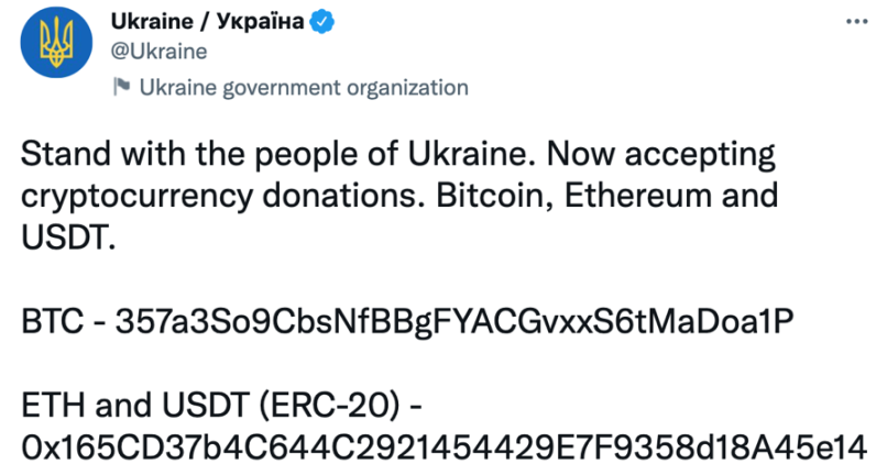 2月26日,乌克兰政府在推特公布官方受捐地址,呼吁以BTC、ETH、USDT形式的加密捐款援助乌克兰。随后,乌克兰政府又公布了DOGE、波卡等虚拟货币受捐地址。
