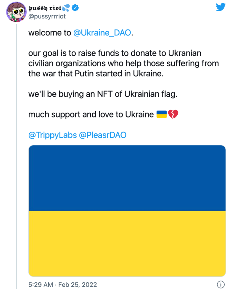 2月25日,战争打响的第二天UkraineDAO正式成立,创始人发推表示UkraineDAO的目标是筹集资金,向乌克兰民间组织捐款,帮助那些遭受战争之苦的人。