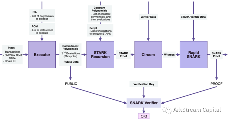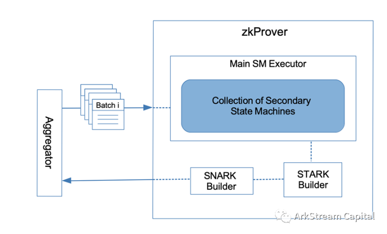 zkProver 内部包含 Main State Machine Executor(Executor), Secondary StateMachines(STARKRecursion Component), STARK Builder(CIRCOM Library)和 SNARK Builder(zk-SNARK Prover),括号为另一种理解方式,参考图。