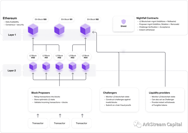 Polygon Nightfall:主打隐私的、混合了 Optimistic 和 ZK 两种 Rollup 方式的企业级 L2。本质依然是 ORU 的 L2,但是结合了 ZKP 的技术加强隐私保护。Nightfall 是由安永公司创建,与 Polygon 合作是为了在企业级区块链方面进行更多的探索。主网计划在 2022 年发布。