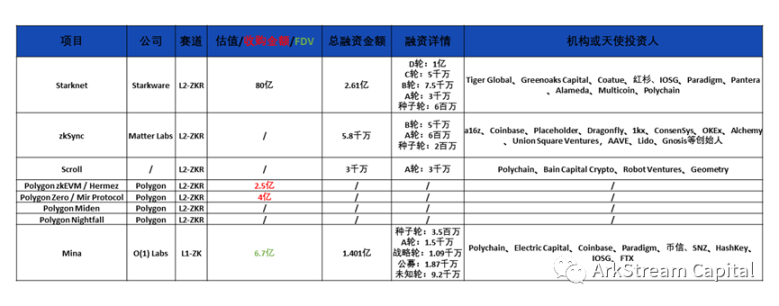 可以看出, ZK 扩容项目估值最高的是 Starkware,高达 80 亿,ZK 隐私项目最高的是 Aleo,估值 14.5 亿。考虑到项目在隐私和扩容叙事可以并行出发,甚至一些隐私项目是双层网络,所以,难以比较两个赛道的平均融资金额。单从最高估值而言,扩容赛道在一级市场的认可度是高于隐私赛道。扩容赛道之中,在协议、电路语言、zkVM 和服务项目等多方面有优势的 Starkware 无疑是资本市场的宠儿。另外,其他主打 zkEVM 兼容的扩容项目,也同样获得资本市场的热爱。隐私赛道之中,在电路语言、开发者工具链等方面有优势的 Aleo 比起研发 PLONK 和 PLookup 技术的 Aztec 更为吃香,也侧面说明资本市场对于商业落地型项目的偏重。