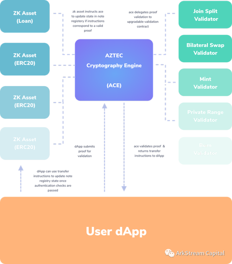 AztecCryptography Engine(ACE):将证明分发给验证和根据证明验证结果更新 Note 注册表的状态。