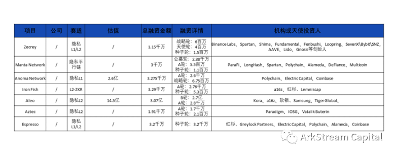 在前面的章节,我们花了较多的篇幅整理和学习了零知识证明在扩容和隐私方向的项目,零知识证明相关的扩容和隐私项目在一级市场也获得了资本的青睐,我们对这两个赛道项目的公开融资数据进行整理,分别如下两图: