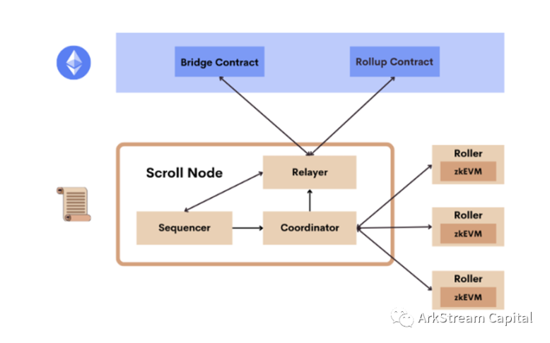 Scroll:原生 zkEVM 方案、集成 ZK 各项前研技术(多项式承诺、Lookup Table、递归证明)和 GPU/ASIC 硬件加速的 ZKR。Scroll 的 L2 网络由 Node(Replayer、Sequencer、Coordinator)和 Roller 组成,以及对应的 L1 上面的 Bridge 和 Rollup 智能合约。推荐大家直接阅读官方发表的架构讲解文章,非常通俗易懂。这里我们简单说说:Sequencer 接收 L2 交易,处理 L2 交易列表,构造区块和状态根,Coordinator 监控区块和分发区块的执行栈给 Roller,Roller 计算 zkEVM 的电路和生成聚合电路证明,再返回给 Coordinator,Coordinator 通过 Replayer 提交到 L1 的 Rollup 合约,Replayer 也承担 L1/L2 通信桥的功能。由于 Scroll 和以太坊基金会 PSE(Privacy& Scaling Explorations)共同在隐私和扩容问题研究一年多时间,Scroll 的 zkEVM 方案非常原生。从 Scroll 公开的代码仓可以看出,zkEVM 方案是与 PSE 一致联动的,而 L2 的 Node 会基于以太坊 Go-Ethereum(Geth)实现。近期 Scroll 有 Pre-alpha 测试网的注册。