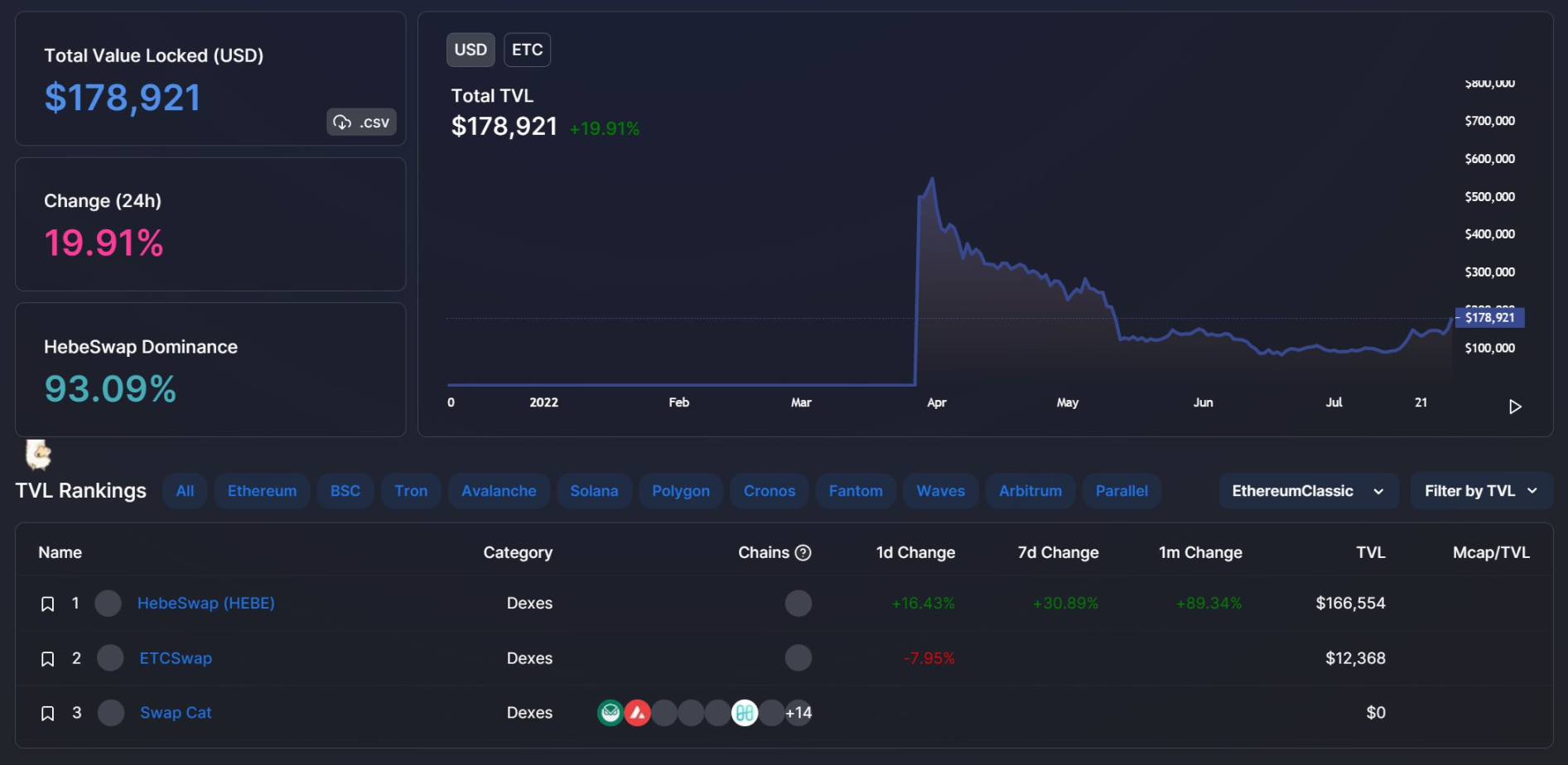 ETC 的 EVM 和 ETH 是一摸一样的,毕竟这两个曾经就是一体的。只不过 ETC 网络很容易被攻击,因此 DeFi 生态一直不温不火。现在 ETC 全网 TVL 大概几十万美金吧,主要是有两个 Swap,这个量很小了可以说是。