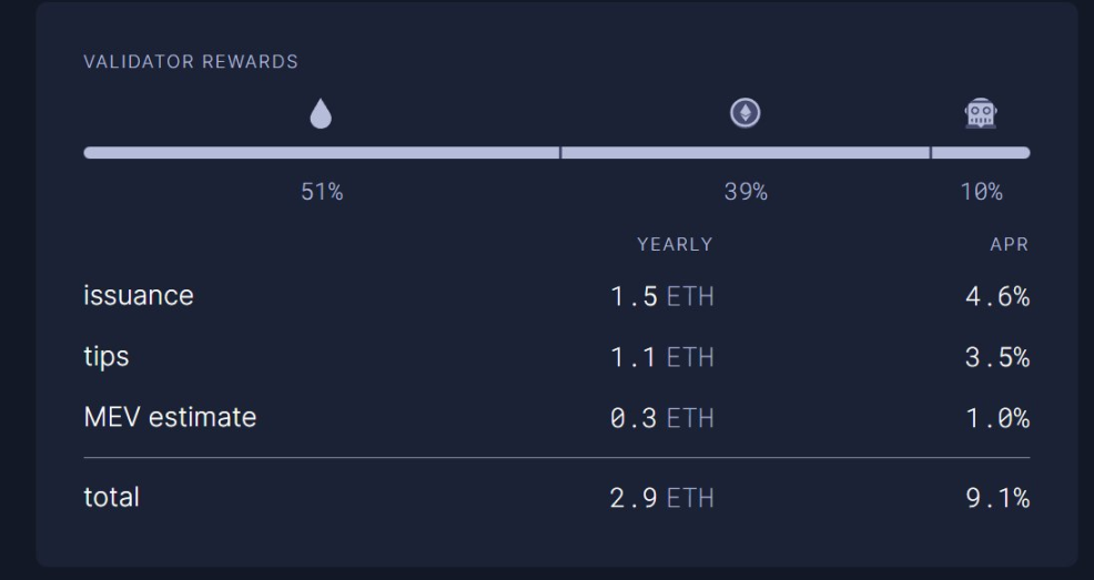 总体来说,大家预期是 5% 左右,但是算上手续费也许可以到 9% 左右。大体规律是,Stake ETH 总量越多,总产量越高,但是分摊到每个验证者头上的收入越少,这个曲线非线性。