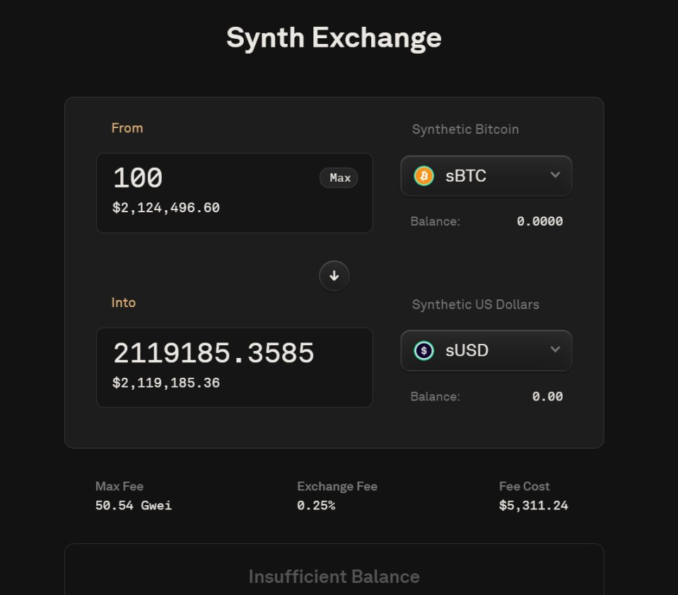 但是,事实上,sBTC 背后并没有 BTC 抵押物,它是怎么和 BTC 锚住价格的呢?答案是,你持有的 sBTC 也可以永远按照市价卖出,也同样没有滑点。