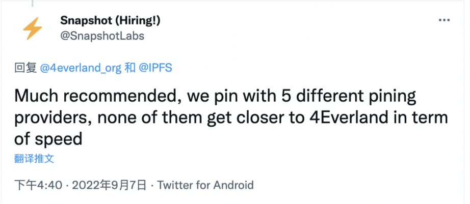在社区的合作运维中,与时俱进,合作的项目多为当下流行且同样值得留意的项目(合作背景深)。总结以往的宣发我们可以看到,4EVERLAND 已经与 zkSync,Polygon,Flow,Near,OKC,Harmony,KCC,Metis,Rei,Heco 等生态达成合作,作为生态的基础设施为开发者提供服务。并且 4EVERLAND 也是 PolygonDAO 的 Vouchers Partner,为 Polygon 的开发者提供免费的服务政策;现在知名的项目包括 SnapShot,RSS3,Lenster,SyncSwap,Relation 等都在使用 4EVERLAND 的服务,值得一提的是,@SnapShot现在拥有 5 家(Pinata,Fleek,Infura,Web3storage 以及 4EVERLAND)IPFS 存储服务提供商,4EVERLAND 的性能是官方团队所反馈最好的;