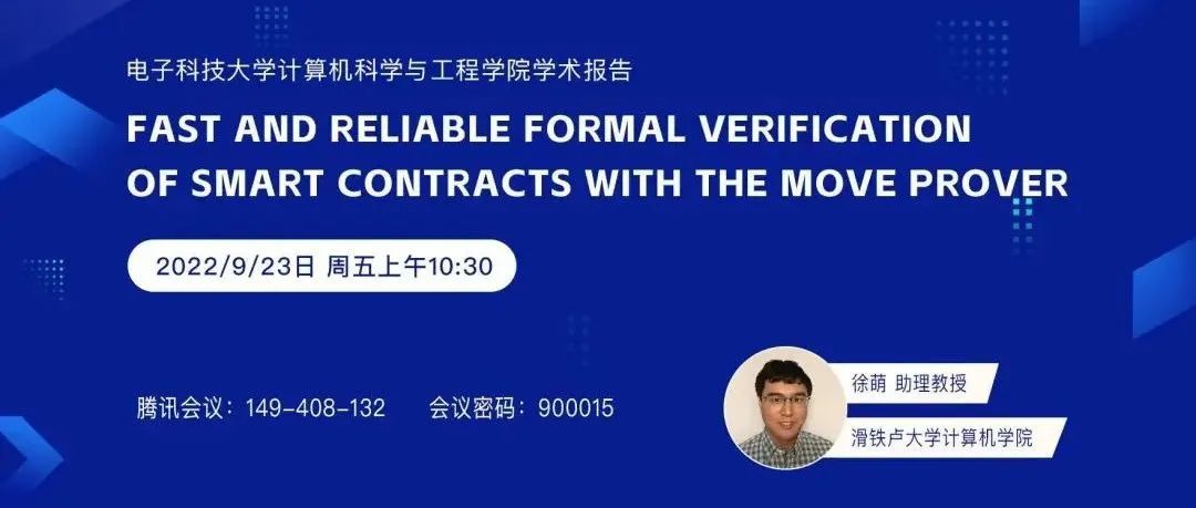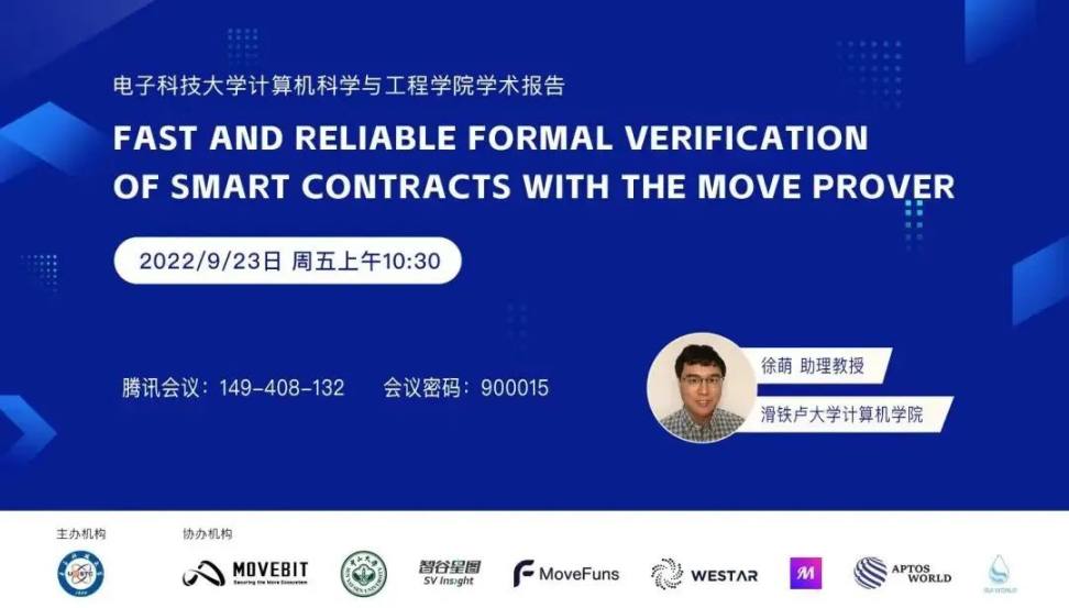 受 MoveBit 和 电子科技大学邀请,Aptos world、SUI world、智谷星图、Mynft、MoveFuns 等机构协办,2022 年 9 月 23 日本周五上午 10:30, 滑铁卢大学计算机学院助理教授徐萌将在线上主讲「用 Move Prover 对智能合约进行快速、可靠的形式化验证」主题学术报告,本次报告使用中文进行。