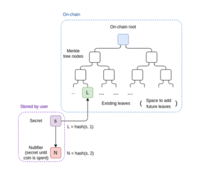 图中蓝色虚线表示链上,紫色虚线表示用户本地存储 On-chain root:链上状态根 Merkle tree nodes:Merkle 树节点 Existing leaves:存在的叶子节点 Space to add future leaves: 用来存放将来的叶子节点的空间 Secret:秘密值 Nullifier(secret until coin is spent):无效符(直到币被花费前一直保密)