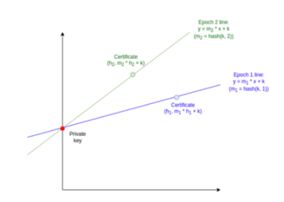 Certificate: 证书 Epoch1 line:阶段 1 的直线 Epoch2 line:阶段 2 的直线 Private key:私钥