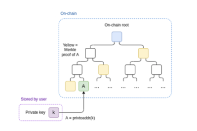 图中蓝色虚线表示链上,紫色虚线表示用户本地存储,黄色方框表示 A 的 Merkle 证明 On-chain root:链上状态根 Private key:用户私钥