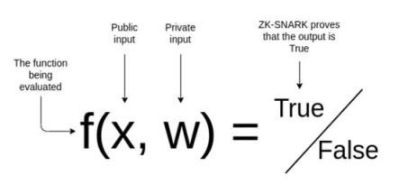 The function being evaluated:取值函数 Public input:公共输入 Private input 秘密输入 ZK-SNARK proves that the output is True:ZK-SNARK 证明输出值是 True