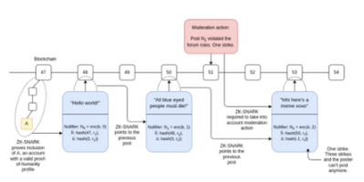 假设我们想建立 0chan,一个像 4chan 一样提供完全匿名性的互联网论坛(所以你甚至没有永久的用户名),但有一个声誉系统来鼓励更多高质量的内容。这可能是一个这样的系统,其中一些审核 DAO 可以将帖子标记为违反系统规则,并建立“三次违规则出局”机制,它可能是用户能够对帖子投赞成票和反对票,有很多配置。声誉系统可以支持正面或负面的声誉;然而,支持负面声誉需要额外的基础设施来要求用户在他们的证明中考虑所有声誉消息,甚至是负面消息。我们将重点关注的是这个更难的用例,它类似于 Unirep Social 正在实施的用例。