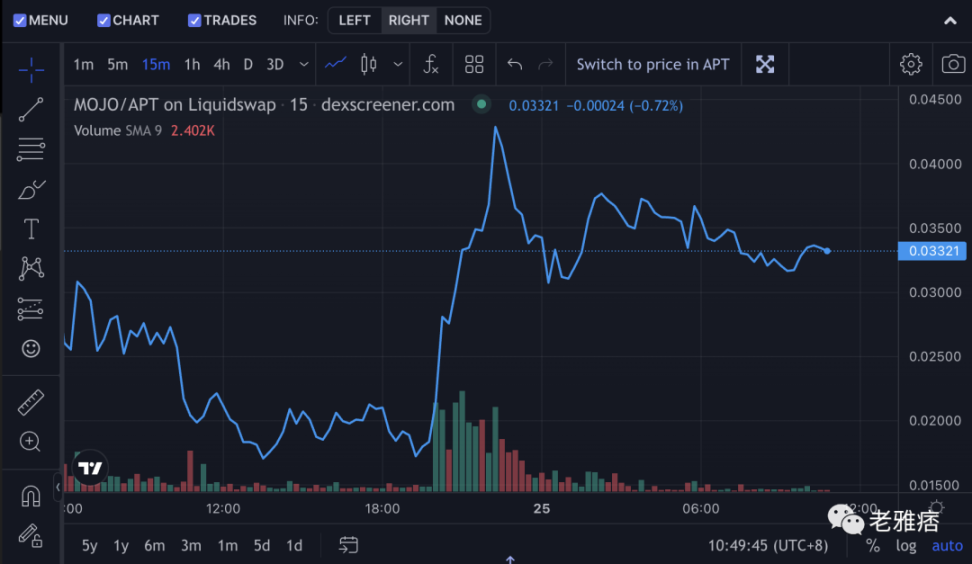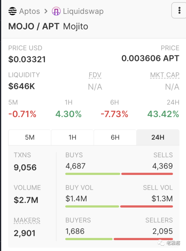 从那时起,开始在 liquididswap.com 和 Mojito DEX 上进行交易。考虑到过去几天 APT 价格的变化,在经历了一些初步的价格波动后,我们可以看到代币的价格已经稳定在 IDO 的起始价格左右。能够观察到一个地址以接近起始价格出售 MOJO,并将价格保持在接近当前价格。这波操作看起来确实有些令人担忧。