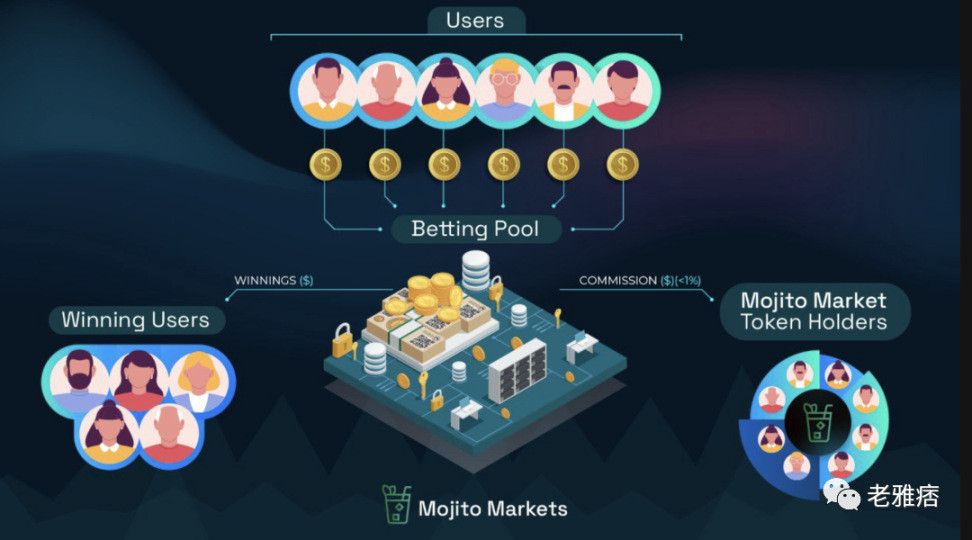 Mojito Markets 并不像传统的博彩公司那样采取对赌的方式。相反,作为用户之间的促进者,通过收取少量费用来促进这种交易,从而获得收入。交易的参与者是那些根据市场的结果而获得 / 失去收益的人。