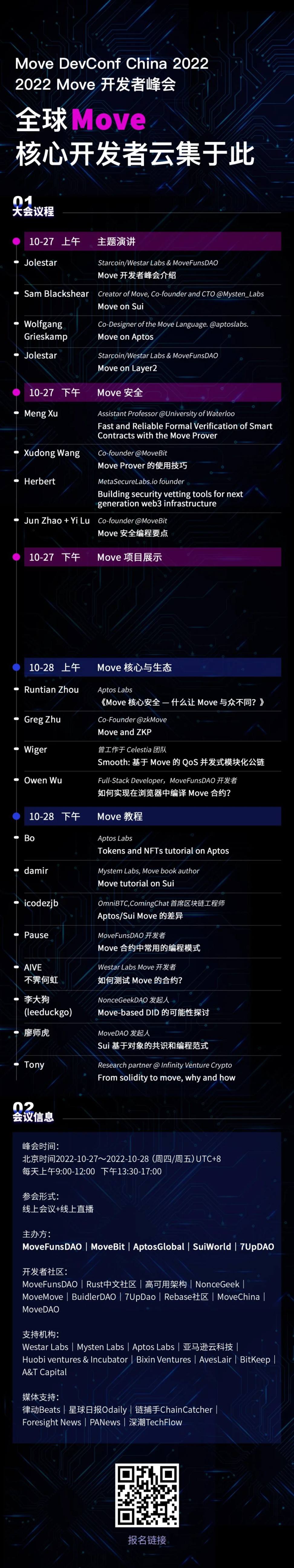 10 月 27 日至 10 月 28 日, 亚太地区首场、规模最大、嘉宾最重磅的 Move 开发者峰会将正式开幕,数十名 Move 开发者、研究人员和创业者将汇聚一堂,和大家一起探讨 Move 开发的主要特性、使用案例及最新进展。