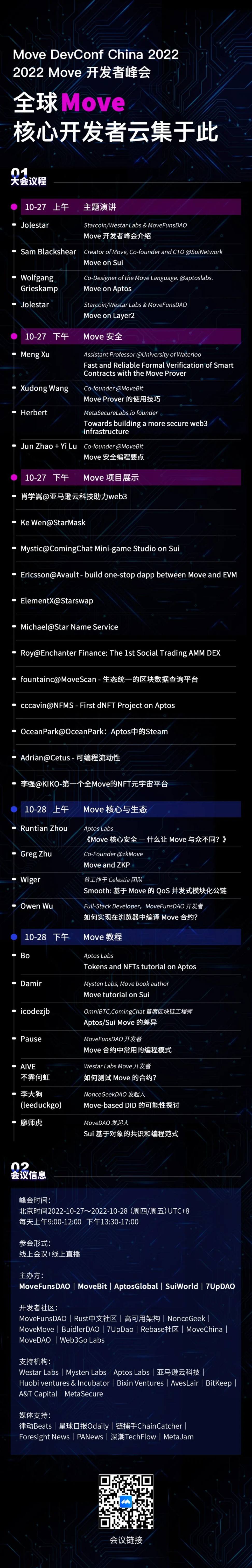 10 月 27 日至 10 月 28 日, 亚太地区首场、规模最大、嘉宾最重磅的 Move 开发者峰会将正式开幕,数十名 Move 开发者、研究人员和创业者将汇聚一堂,和大家一起探讨 Move 开发的主要特性、使用案例及最新进展。