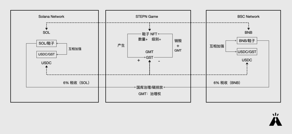 通过修改升级成本、Mint 成本、开宝箱的成本,均可以起到调节市场的作用。譬如降低 Mint 成本会刺激用户合成新鞋,从而增加鞋子供应量,一方面消化 GST 通胀,一方面通过供给调节鞋子价格。