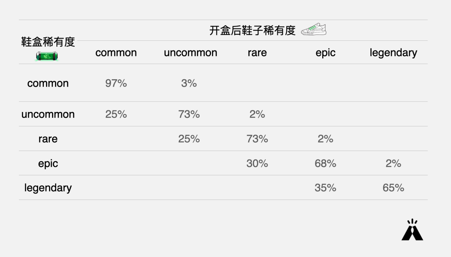 如下图,两个灰鞋 100% Mint 出灰色鞋盒,但灰色鞋盒有 3% 概率开出绿鞋。