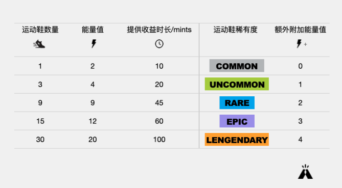 进入游戏必须先购买鞋子,通过增加鞋子数量、提高鞋子品质(稀缺度)、升级鞋子、添加附加性能,可以增加 Move-to-Earn 时长、提高奖励上限和效率,从而获得更多的代币奖励。