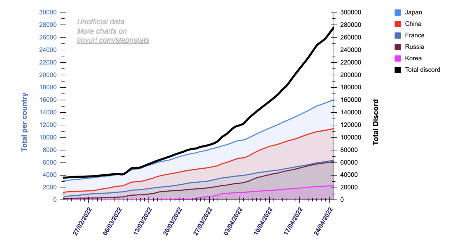 STEPN 尚未对外开放其用户数据,但据其推特和创始人在 AMA 中的披露,截止目前(4 月 30 日)日活跃用户已达到 50 万人。从用户的国家分布来看,日本和中国用户是最多的;Discord 粉丝数也在强劲增长: