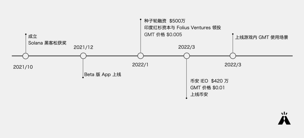 2022 年 1 月 STEPN 完成由印度红杉资本与 Folius Ventures 领投的 500 万美元种子轮融资。2022 年 3 月通过币安 LaunchPad 完成 420 万美元融资,随后其治理代币 GMT 上线币安。