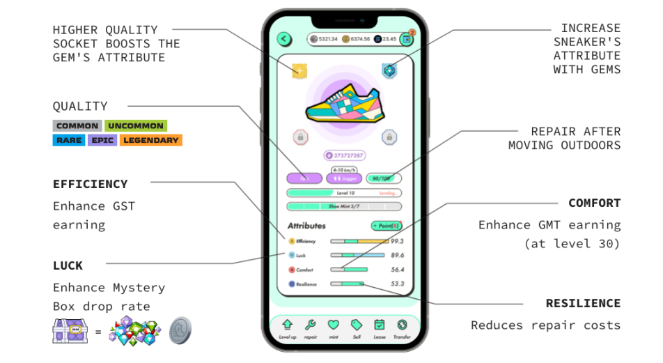 除了鞋子本身品质和基础性能之外,还可以给鞋子增加附加性能。每双鞋有 4 个插槽,插槽与鞋子一样具有稀有度,不同稀有度属性奖励不同。宝石可以插在对应插槽中提高属性。同时宝石可以合成,三颗相同低等级宝石可以合成为一颗高等级宝石。宝石是鞋子升至满级后增加性能的方式,合成宝石需要销毁 GST、且有合成失败的风险。