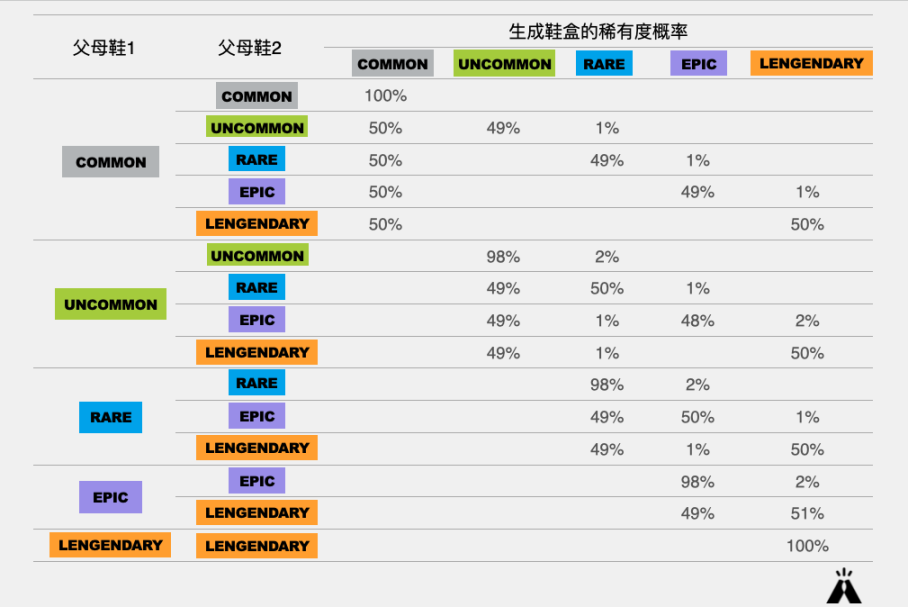 STEPN 游戏内容中存在的鞋子、宝石、鞋盒、宝箱、插槽、Mint 均有相匹配的概率设计。而这些影响玩家收益的概率设计又与鞋子属性相关。譬如玩家 Mint 后得到的鞋盒稀有度由父母鞋决定,同时开启鞋盒时,又有一定几率获得升级。