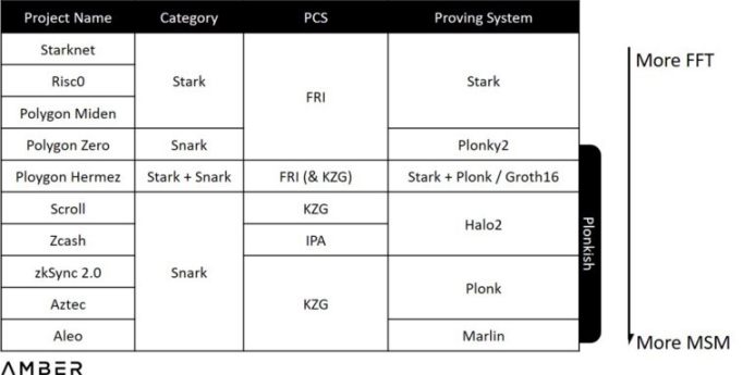 Paradigm 的 Georgios Konstantopoulos 在他关于硬件加速的报告中解释说用于证明生成的时间主要由两种类型的计算任务控制:MSM(多标量乘法)和 FFT(快速傅立叶变换)。但是,不是使用固定数量,而是建立不同的 PIOP,从不同的 PCS 中进行选择,会带来不同的 FFT/MSM 工作负载比。以 Stark 为例,PCS Stark 使用的 FRI(Fast Reed-Solomon Interactive Oracle Proofs of Proximity)是基于 RS 代码的,而不是 KZG 或 IPA 使用的黄道曲线,因此 MSM 完全不参与整个证明一代。我们在下面展示了不同证明系统的工作负载比率的粗略顺序,需要注意的是 1)很难估计整个系统的确切比率;2)项目在实施时通常对系统有自己的修改。