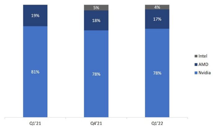 GPU 市场由 Nvidia 主导。根据 Jon Peddie Research 的数据,其 2022 年第一季度独立 GPU 出货量的市场份额为 78%。尽管与 MSRP(制造商建议零售价)相比,许多卡的价格仍然很高,但它们的可用性正在不断提高。2021 年,出货量超过 5000 万个 GPU(价值 520 亿美元)。从这个数字来看,这几乎是同期 FPGA 销量的 8.5 倍。