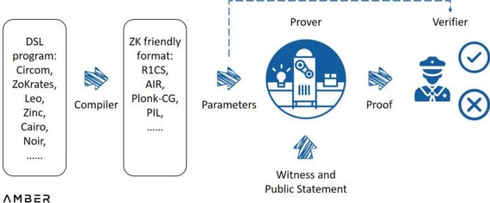 一个典型的 ZK 系统的工作原理如下:工程师首先用特定领域的语言写出要验证的语句,然后将其编译成 ZK 友好的格式,例如算术电路。在使用这种格式生成参数后,证明系统将它们与它见证的秘密一起作为输入来计算证明。验证者可以使用参数和证明通过相对简单的计算来决定它是否可以接受。特别是对于 ZK rollup,程序或合约本身部署在 layer2 上,编译、参数和证明生成将由一些 layer2 节点在链下执行,证明将在以太坊主网上发布和验证。