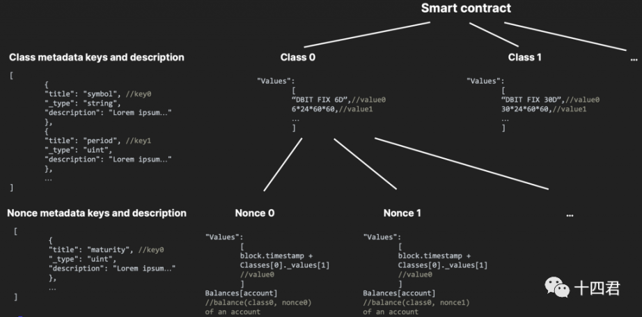 在 3475 中每个债务合同就是一个 Class 0,一个合约可以发行多个合同,类似 NFT 的 ID,每个 class 都管理有多个数据,记录合同的名字、缩写、说明等文本化信息,每个信息还能进一步拆分出类型以及数值,比如合同金额、合同时间、交割人、交割物、公证机构单位、营业执照编号等。