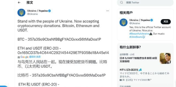 俄乌战争,乌克兰在官方推特公布 BTC,ETH 地址,接受加密货币捐款。