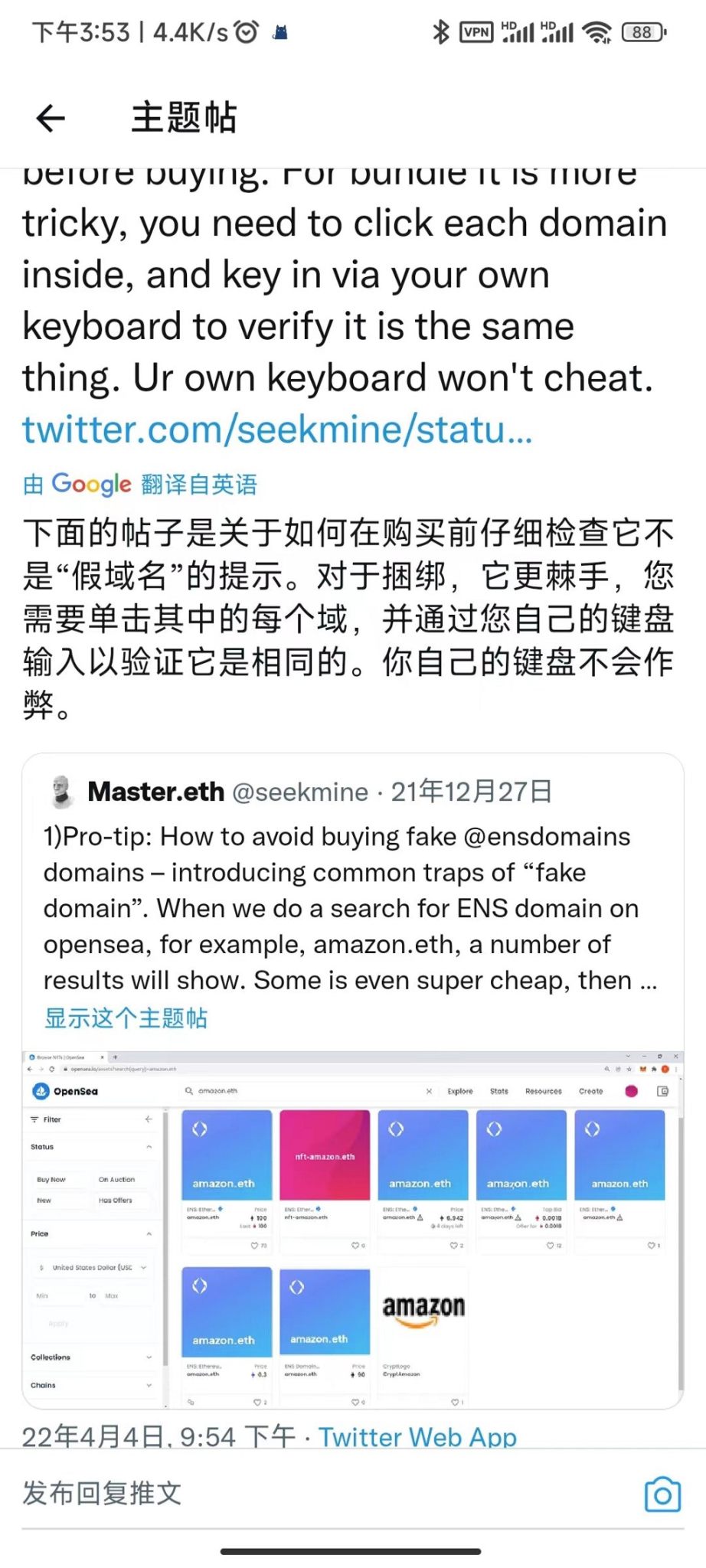 在相关推文中,我甚至看到博主挂单卖.eth 域名的同时,还要教大家如何识别 zwj 假域名: