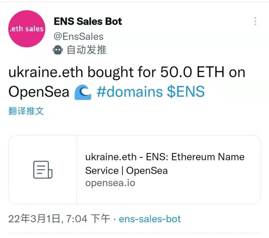 乌克兰捐款事件还有个不为人知的小细节,那就是 Ukraine.eth 以 50ETH 的价格成交(大概 100w 人民币),而该域名成本只有 5u,算上 gas 费大概 1k 人民币出头。