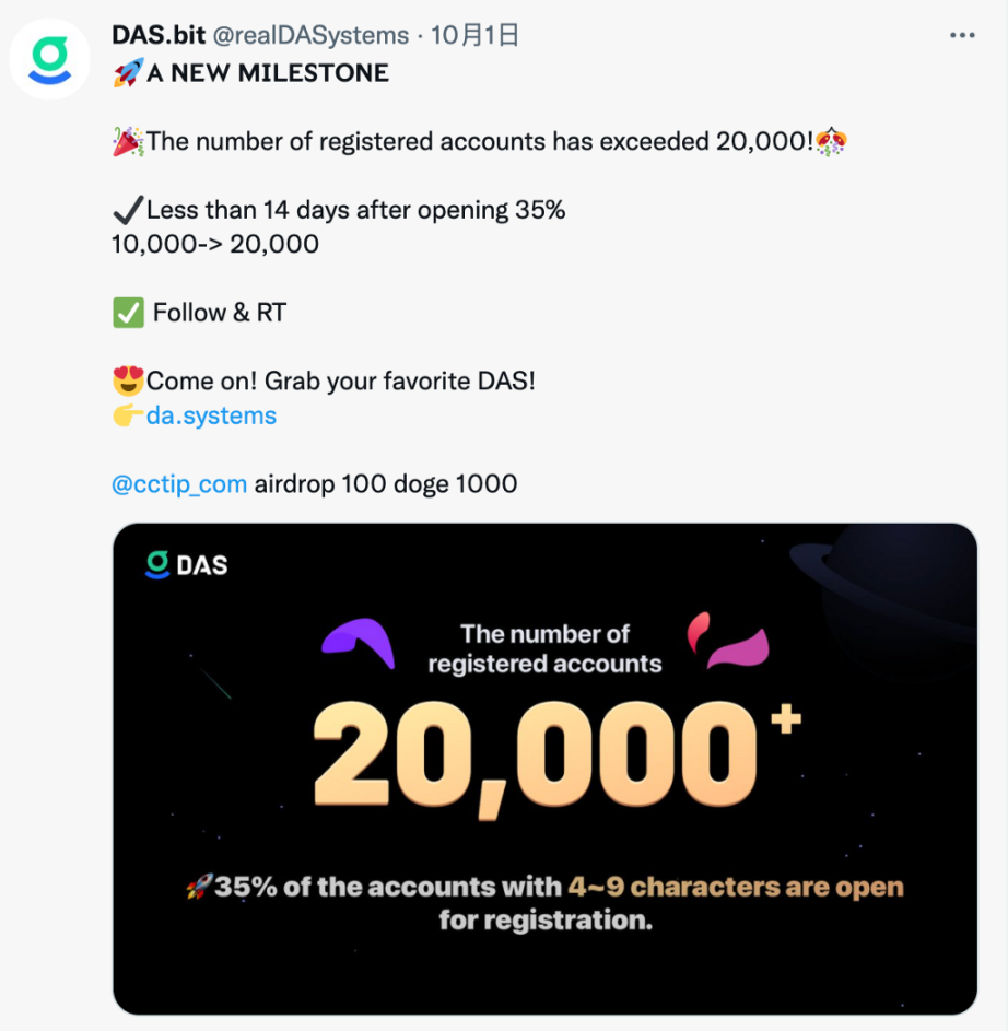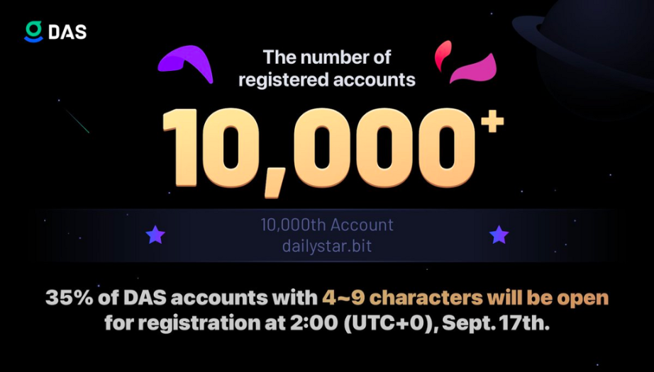 在开放 4–9 位的 35% 以及 10 位以上的全量账号后,在不到两周的时间里,注册量就到 1 万。使得国庆这一天到来时,DAS 全网注册账号数突破 2 万个。