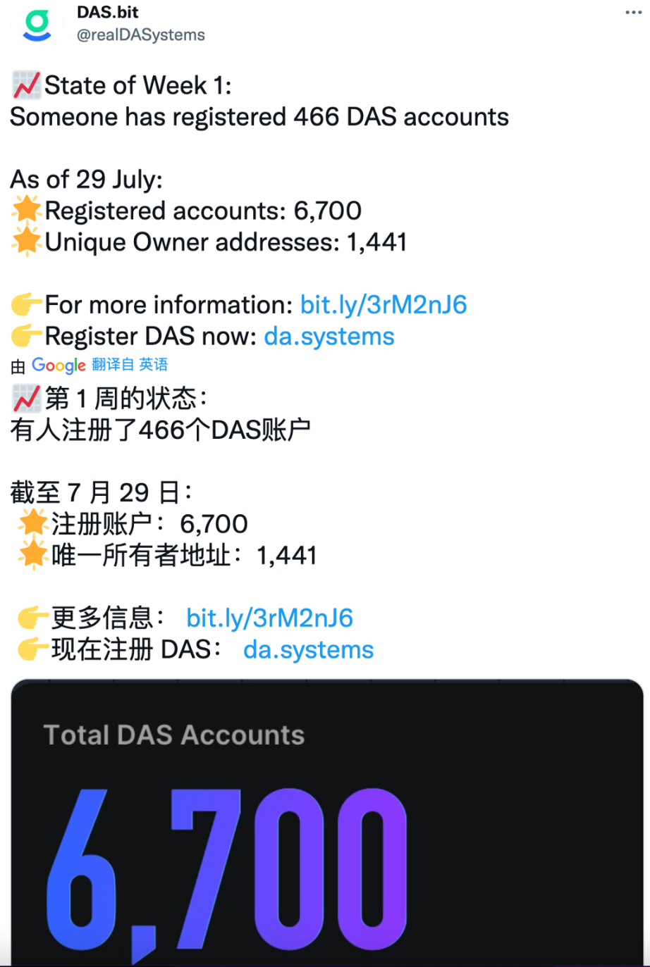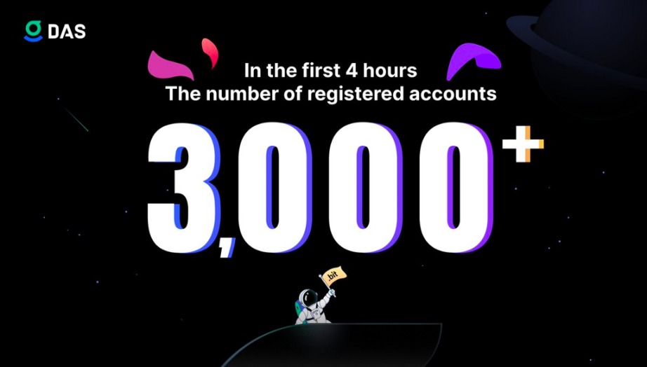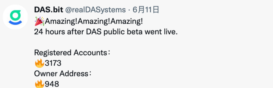 6/10,DAS 启动公测,启动公测的 24 小时内,注册账户便突破 3000+,超过 900 个独立地址参与注册: