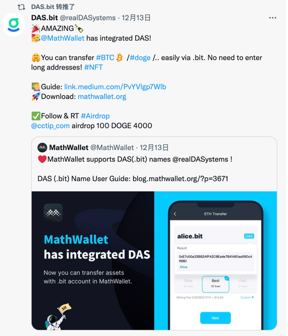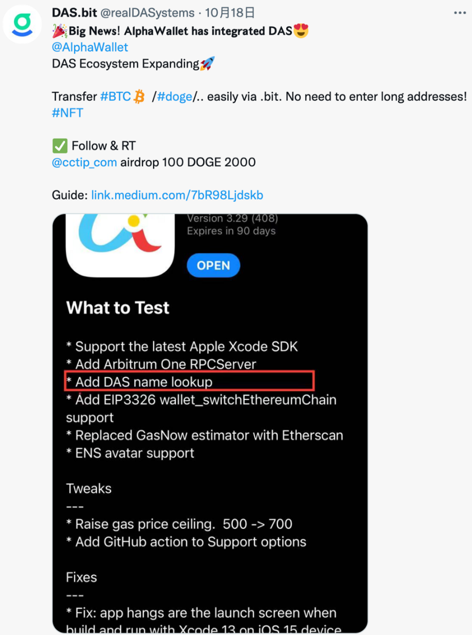 我还记得 AlphaWallet 集成的故事,当时我去申请上架 das.la 这个应用,在表单里介绍了 DAS,他们的开发负责人就回复了很长的邮件,表示对 DAS 很感兴趣,我将他介绍给了 DAS 团队以获得更快捷的支持。