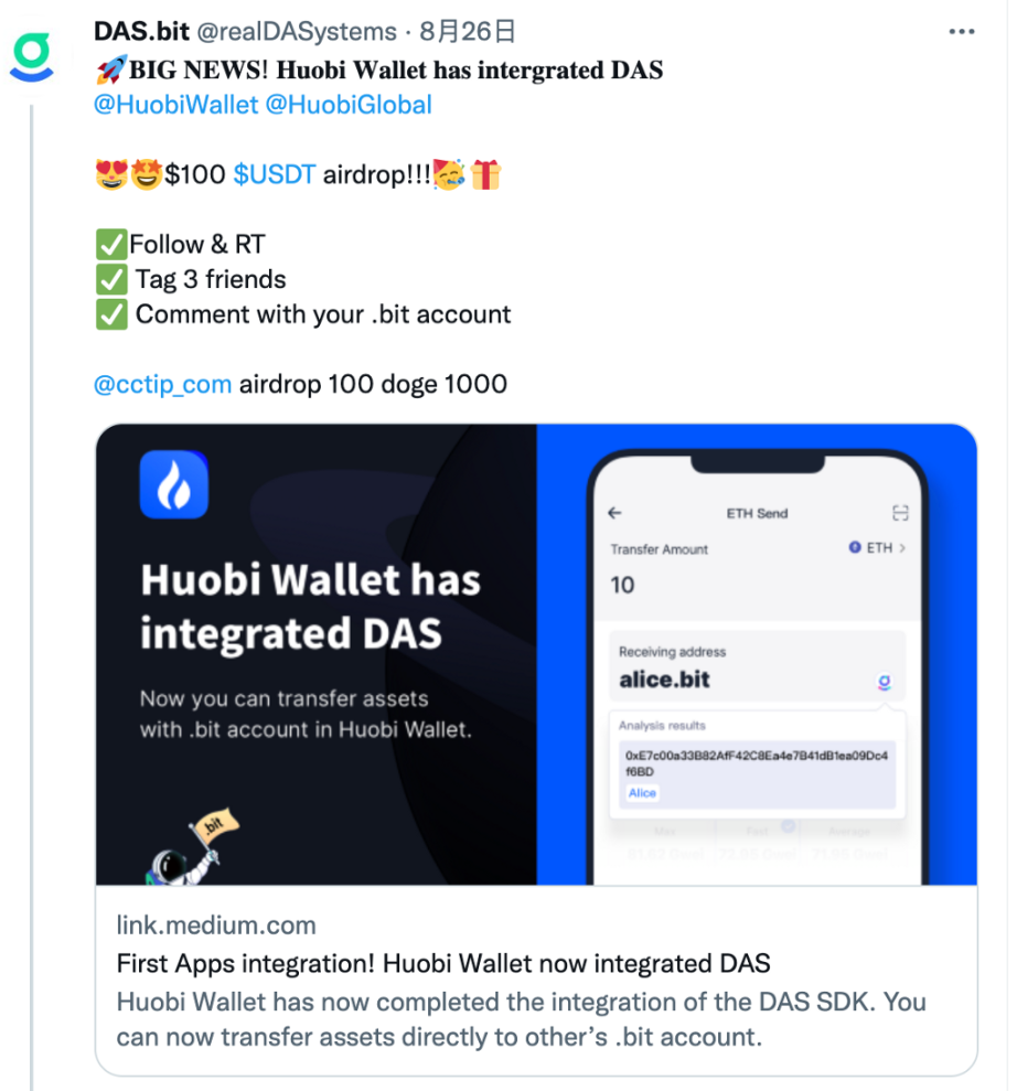 8/26,对于 DAS 来说,又是一个新的里程碑的日子,因为这一天,同时有两个钱包 — — 秘宝、火币钱包,先后宣布完成了 DAS 的集成。