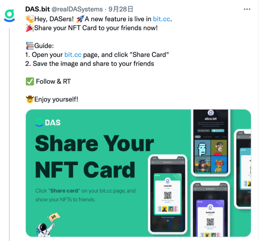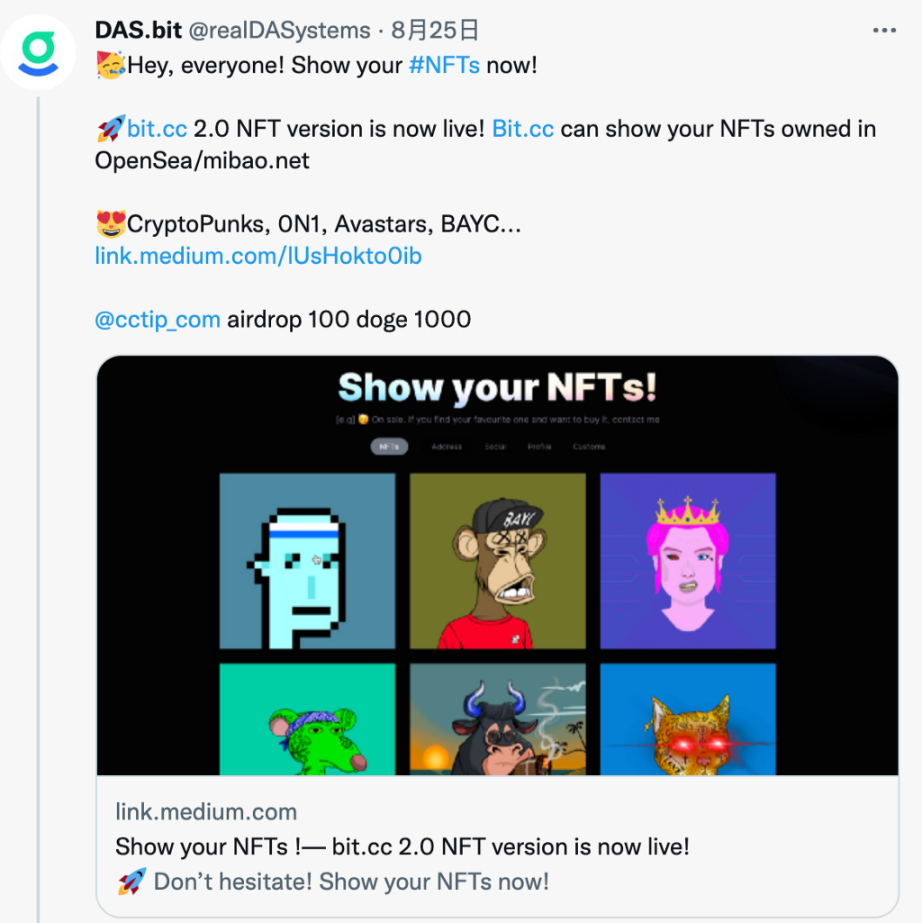 这个版本的上线让人眼前一亮,它支持 OpenSea、CKB 上的 NFT 展示。你使用以太坊地址注册了一个 DAS 账号之后,你就获得了一个 bit.cc 的主页,如果你这个以太坊地址下在 OpenSea 上有 NFT,那么你打开你 das 账号对应的 bit.cc 主页,便可看到。