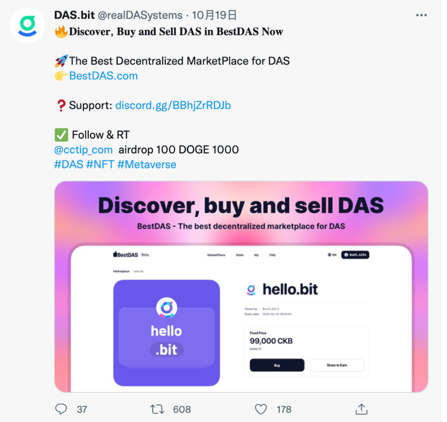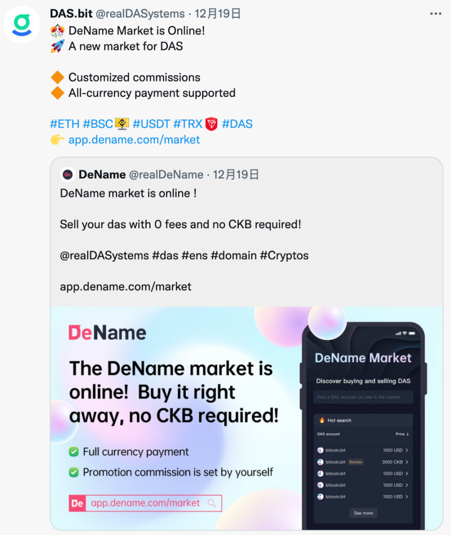 bestdas.com 是一个完全去中心化的 DAS 交易市场。12/19 上线了 DeName 渠道商的二级市场,通过 DeName 渠道注册的 DAS 账号,可以挂单到 DeName 的二级市场进行交易,接受 USDT、CKB 价格挂单,极大程度地方便了 DeName 渠道的用户。