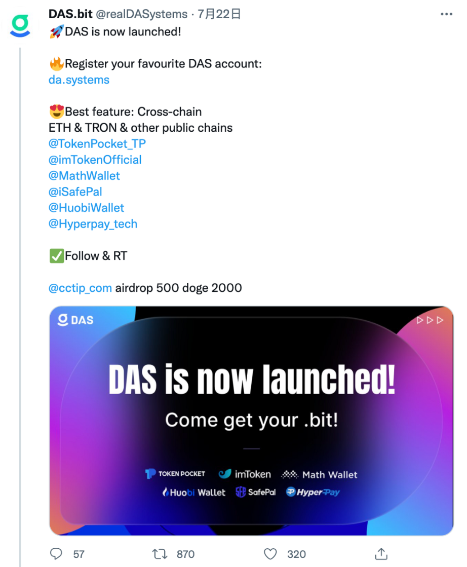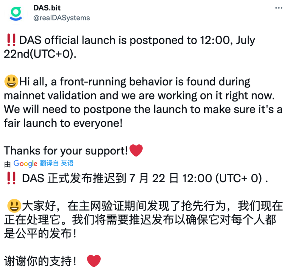 其实上线前还有一个插曲,原计划是北京时间 7/21 日晚 20 点上线,就在当天下午,DAS 团队已经把主网合约都部署上去了,这时社区的有个小伙伴反馈了一个问题,团队评估了该问题会影响启动的公平性,马上紧急处理,由于需要重新测试,部署合约,不得不延期到 22 日进行。