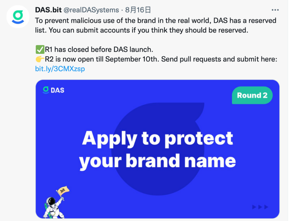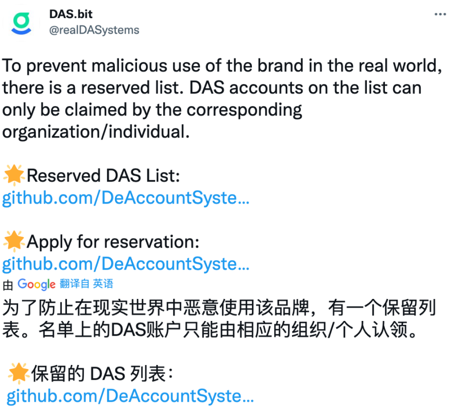 为了防止在现实世界中某些品牌的账号被恶意使用,DAS 设置了一个账号保留列表。名单上的 DAS 账户只能由相应的组织 / 个人认领,在 DAS 上线之后的一年内,这些组织都可以来免费认领。超过时间还未认领的保留账号,将会以拍卖的形式分发出去(细则待定)。
