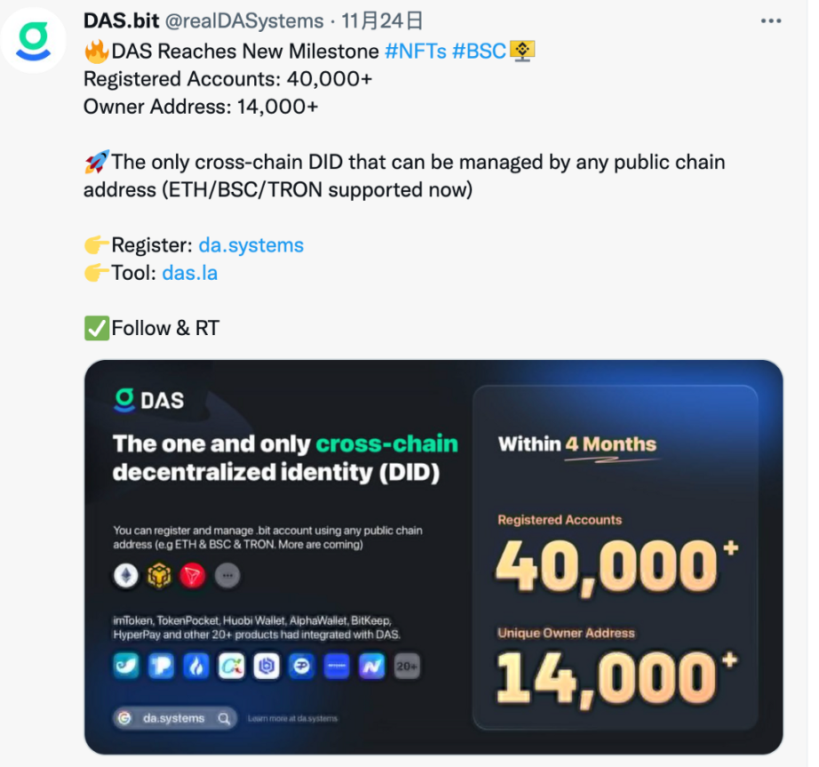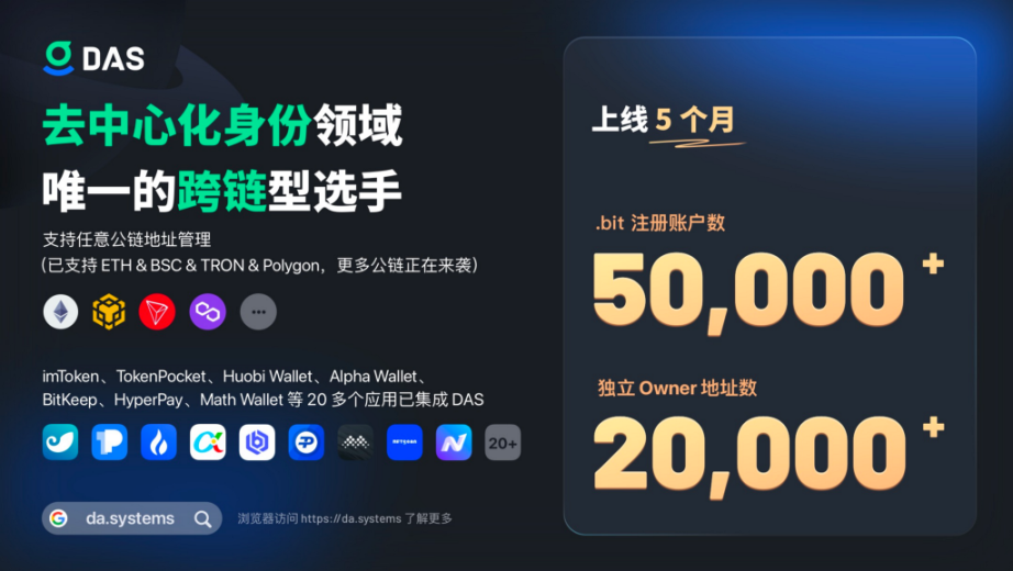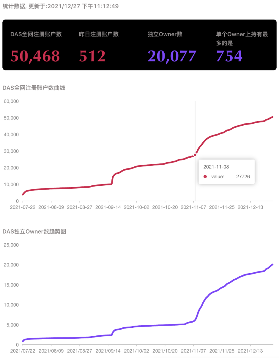与当前最接近的里程碑是截止 12/27 午间,DAS 全网注册账号突破 5 万个,独立 Owner 地址数突破 2 万个。