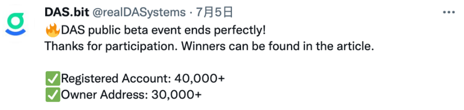 在不到一个月的公测活动时间里,注册账户数超过 40,000 个,独立地址数超过 30,000 个。虽说都是测试网的地址和数据,看得出来社区对 DAS 的追捧度极高。