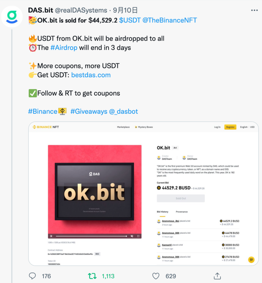 ok.bit 在币安 NFT 上进行拍卖,最终以 $44529 的价格成交: