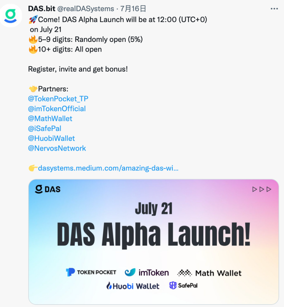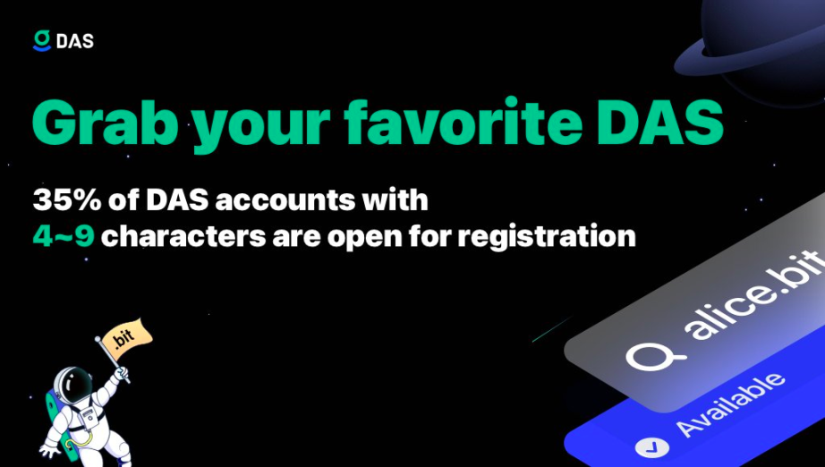 随着生态应用不断集成 DAS,同时从注册数据来看,此前开放的 5% 账号已经无法满足社区用户的需求,在此双重条件下,DAS 开放 5–9 位账号的 35%。