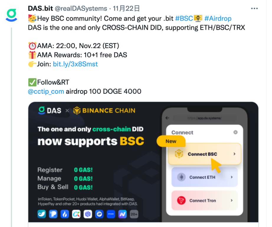 BSC 有大量的用户群,通过集成 BSC 链,可以让 BSC 上的用户方便地接入 DAS,使用其 BSC 地址完成 DAS 账号的注册及管理。
