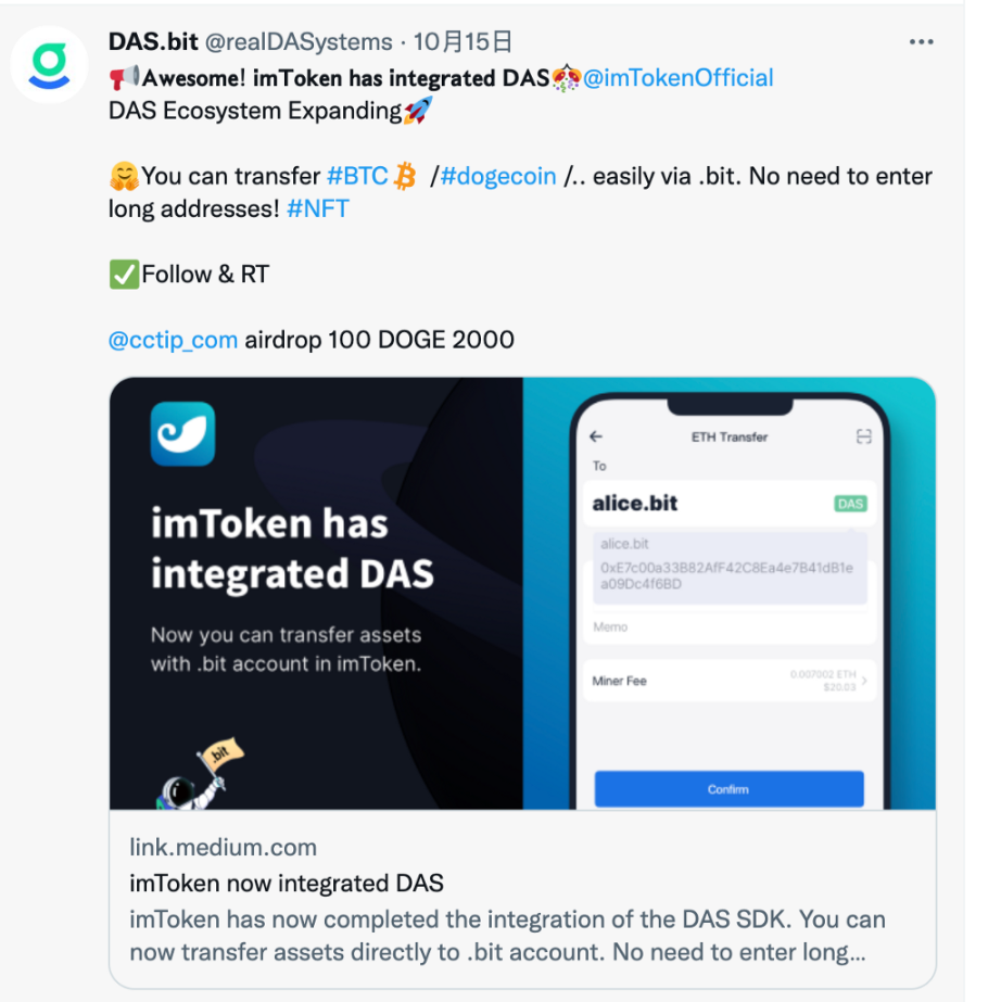 虽然 imToken 集成完 DAS 的消息姗姗来迟,不过还是让社区很激动,这标志着国内三大钱包,均已完成 DAS 的集成。